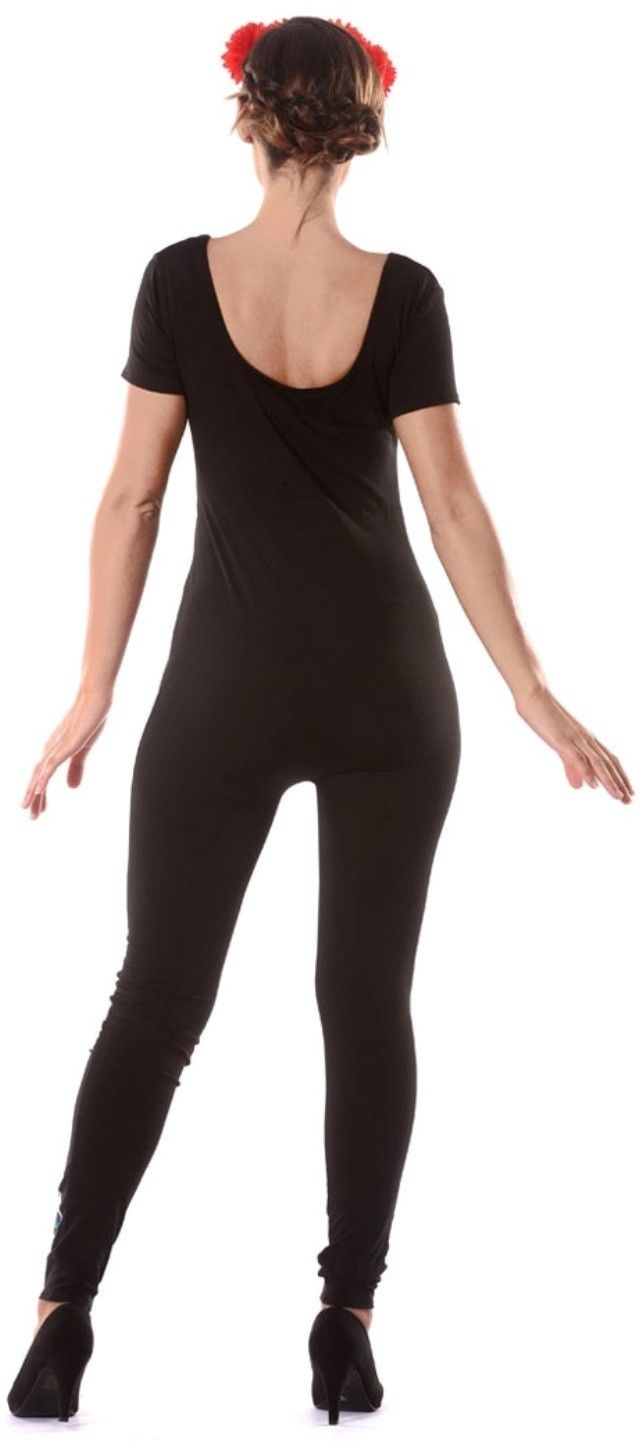Includes a black all in one jumpsuit with a skeleton print to the front which is in a colourful day of the dead design.