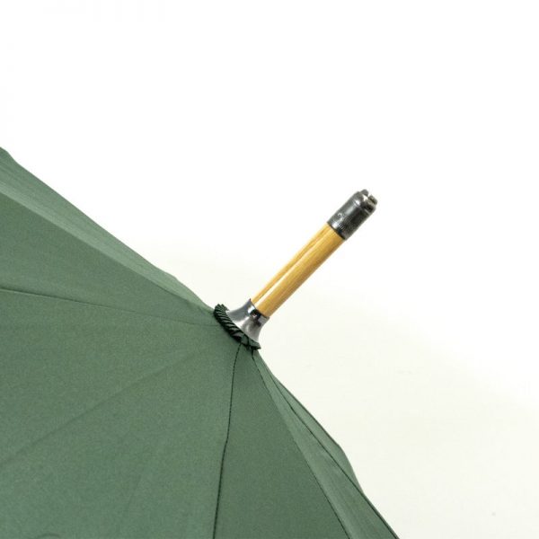 Proper countryside umbrella. Traditional green umbrella with wooden crook handle and shaft. It is also an auto opening umbrella